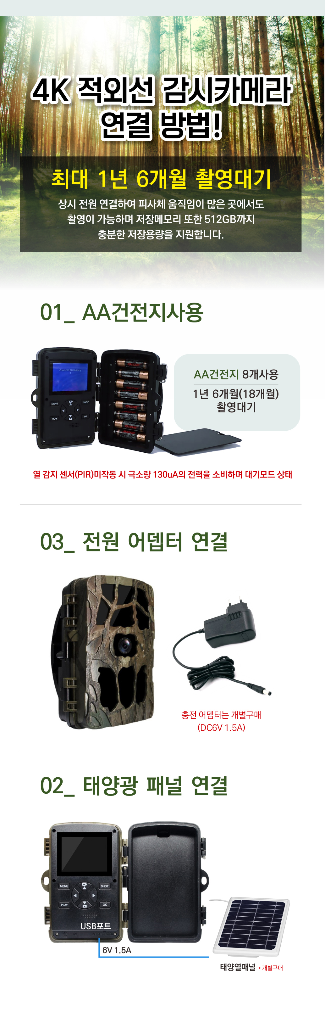 다양한 전원 연결 옵션도 이 제품의 강점이에요. 전원어댑터로 상시 전원을 연결하거나 AA건전지 또는 AA충전지를 사용할 수 있죠. 태양광패널도 연결 가능해서 친환경적이고 경제적인 사용이 가능합니다. 이러한 다양한 전원 방식은 무선 CCTV 시스템으로서의 활용도를 높여줍니다.