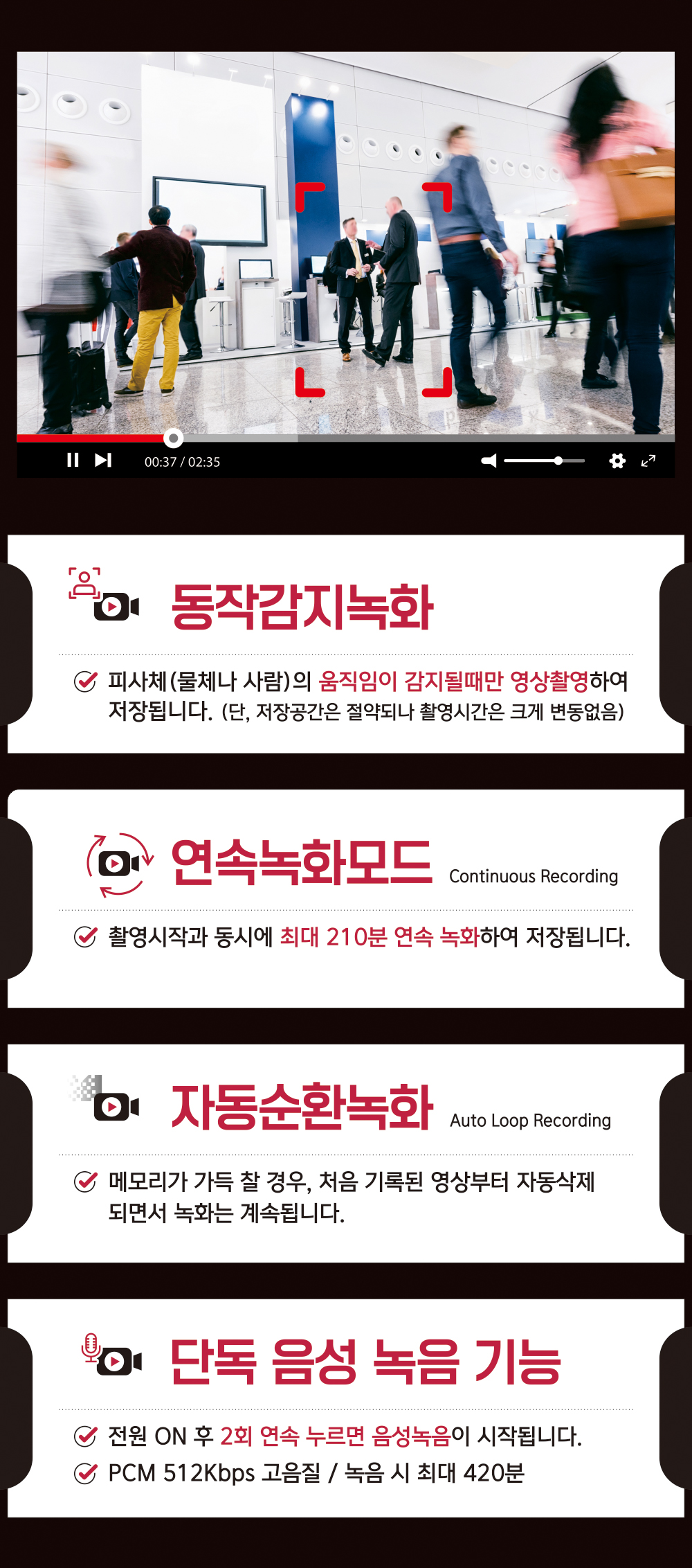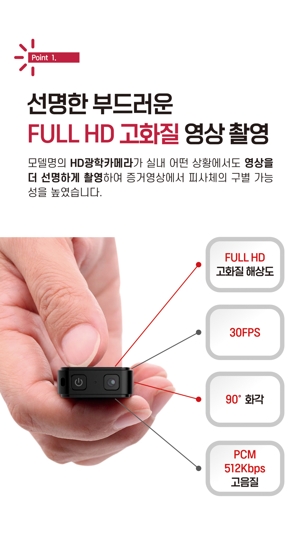스파이캠은 기술의 발전에 힘입어 다양한 기능과 높은 내구성을 자랑하게 되었습니다. 우선 고화질 동영상 촬영 기능과 단독 음성 녹음 기능을 통해 사용자들은 언제 어디서나 중요한 순간을 놓치지 않고 기록할 수 있습니다. 특히 HDR 영상 촬영 기능과 화이트밸런스 기능은 어떠한 조명 조건에서도 선명한 영상 촬영을 가능하게 합니다. 또한 동작 감지 기능과 오버라이트 기능은 효율적인 영상 녹화를 돕고 상시전원연결 촬영 기능과 128GB 대용량 메모리 카드 호환은 장시간 촬영을 지원합니다.