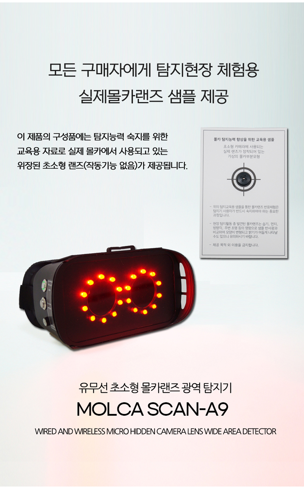 이 제품의 장점은 뛰어난 탐지력에 있습니다. 유무선 렌즈를 신속히 탐지할 수 있으며 넓은 시야각과 고휘도 적색 LED는 감지 속도와 정확성을 향상시킵니다. 또한, 핸드폰 카메라 탐지기 기능으로 몰래카메라의 렌즈 반사광을 유도하고 포착하는 능력이 뛰어나며, 넓은 탐지 구역을 빠르게 스캔할 수 있습니다. 쌍안경 형태로 설계되어 눈의 피로를 줄이고 집중력을 높이는 것도 특징입니다. 관공서, 교육기관, 공공기관 등에서 대량으로 납품되는 신뢰성 높은 장비로, 탐지 업체에서도 애용하고 있습니다.