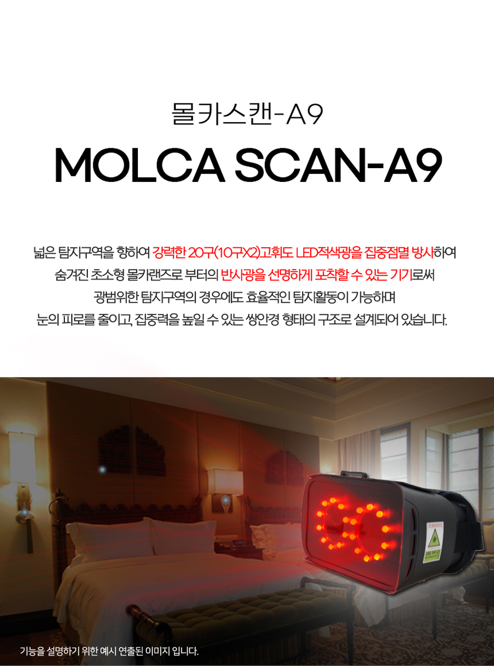 제품 스펙으로는 국산 MOLCA SCAN-A9 모델로, 고휘도 집중형 적색 LED가 사용됐으며 사이즈는 190×120×110 mm로 휴대하기에 적당한 크기예요. 무게는 약 340g으로 가벼워 어디든 쉽게 들고 다닐 수 있고, 리튬폴리머 배터리로 약 6~7시간 사용이 가능해 긴 시간 동안 안심하고 사용할 수 있어요.