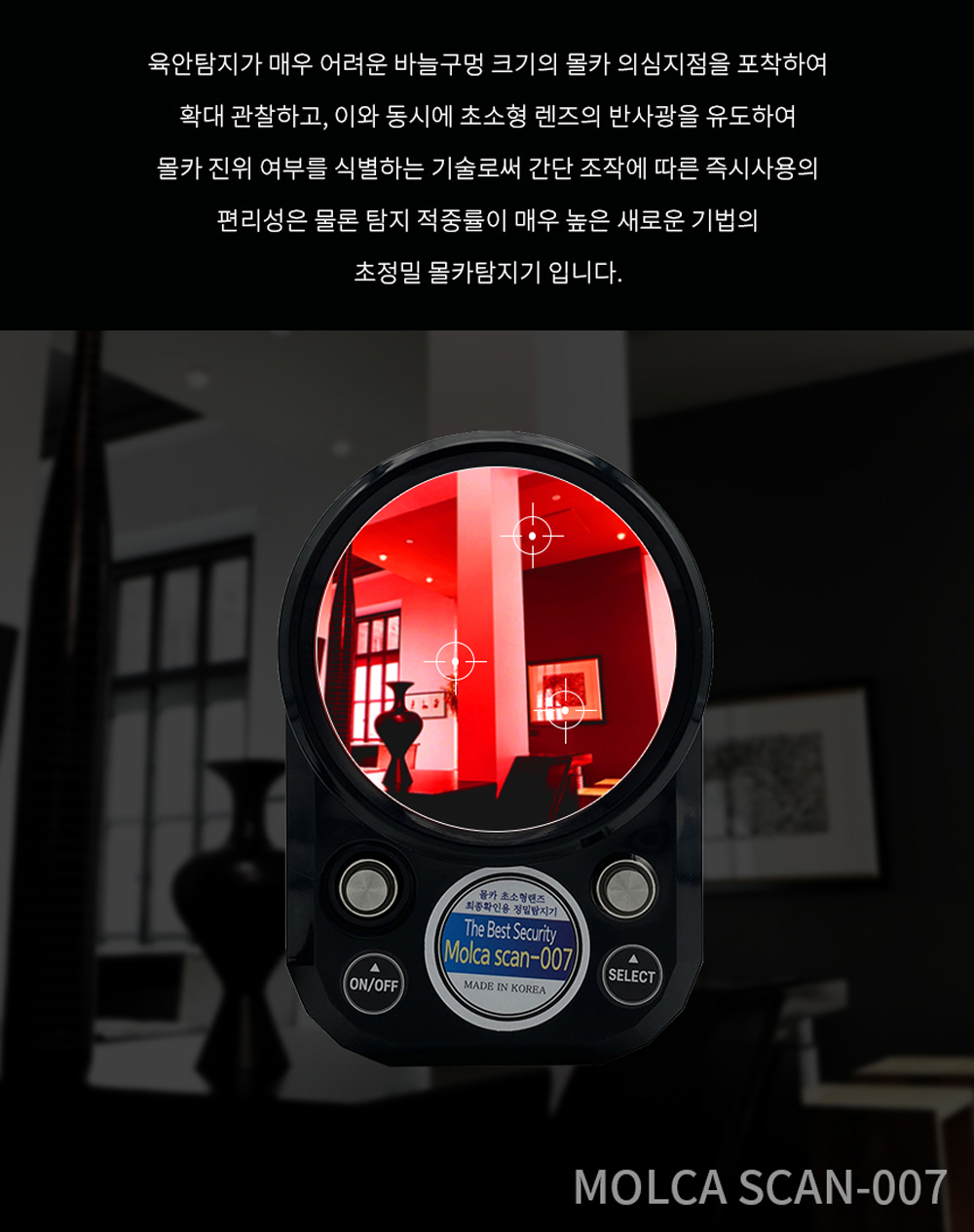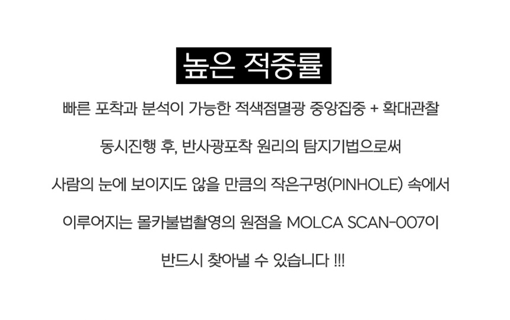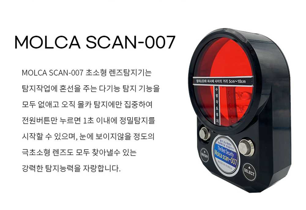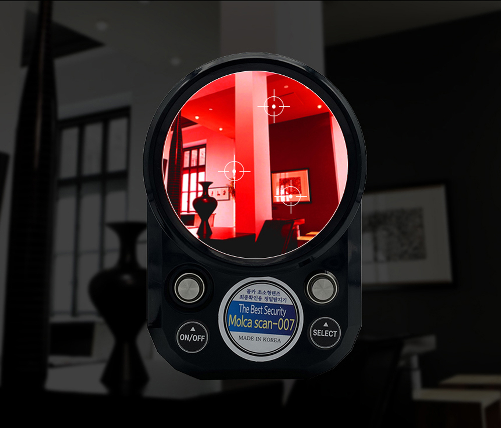 몰래카메라 탐지기 Molca Scan 007은 어디에 숨겨진 초미니 카메라 렌즈도 빠르게 탐지할 수 있는 최고의 기술을 갖추고 있어요. 고휘도 LED 및 IR 적외선 기술을 활용해 몰래카메라 렌즈를 효과적으로 감지하며, 5배율로 확대할 수 있는 뷰파인더를 통해 작은 카메라 렌즈도 확실하게 구별할 수 있어요. 이러한 기능이 결합되면서 몰래카메라로 인한 피해를 예방하는 데에 큰 도움을 줍니다.