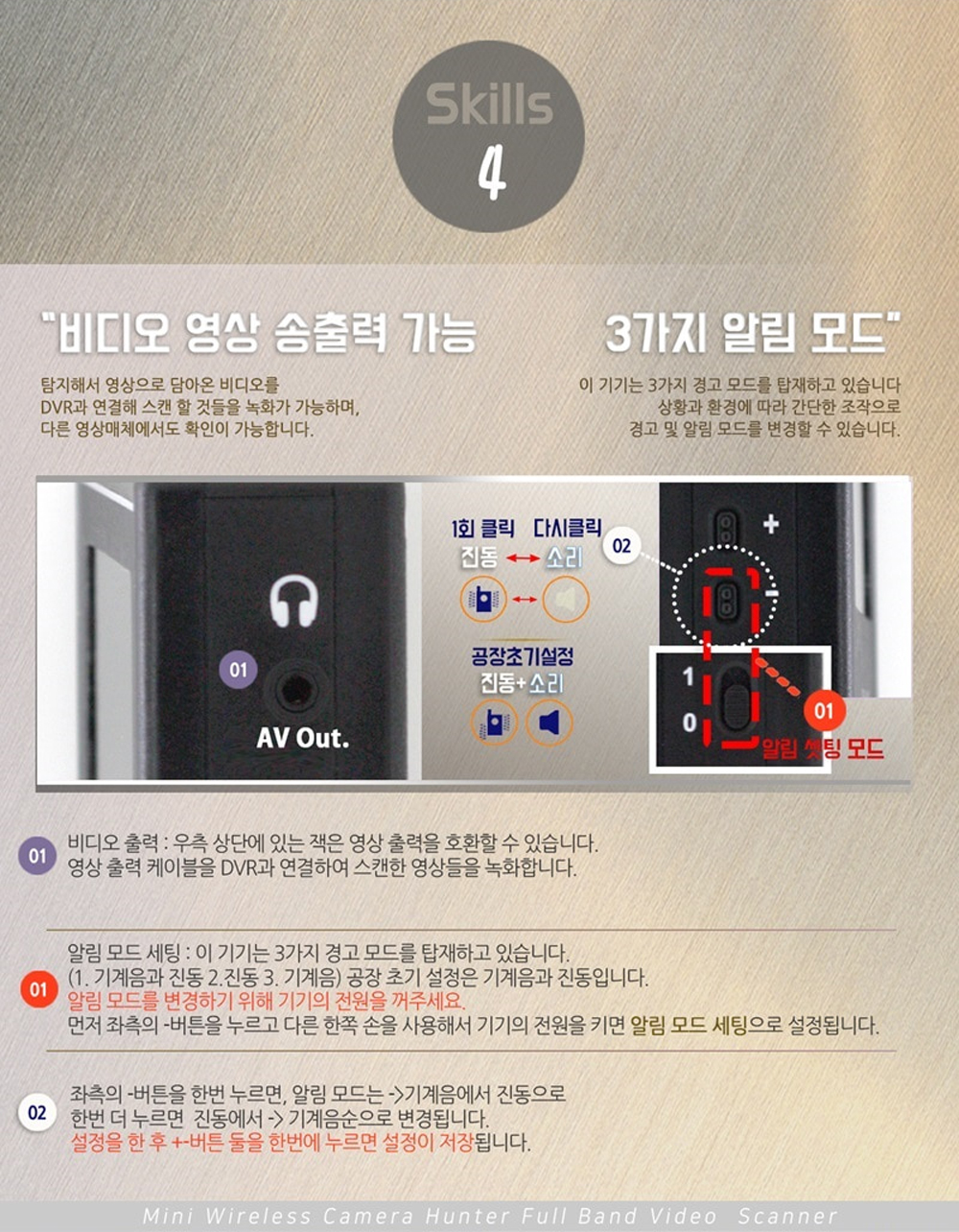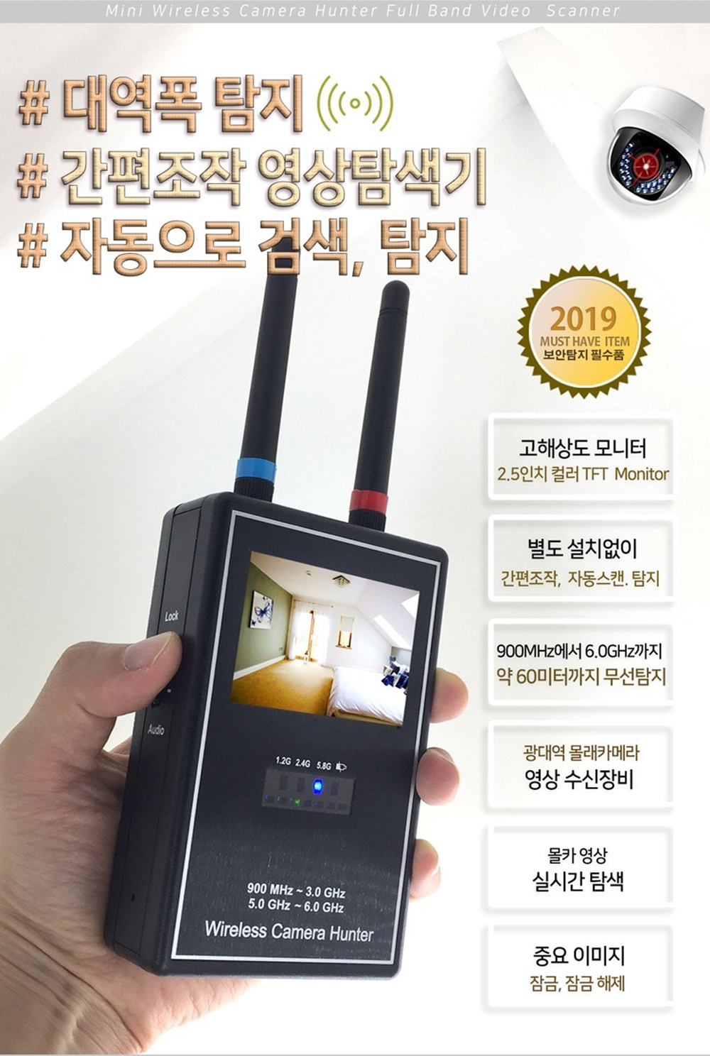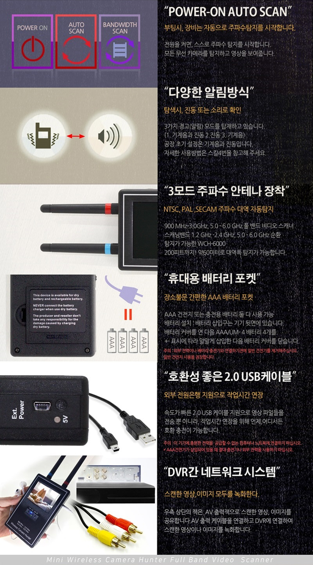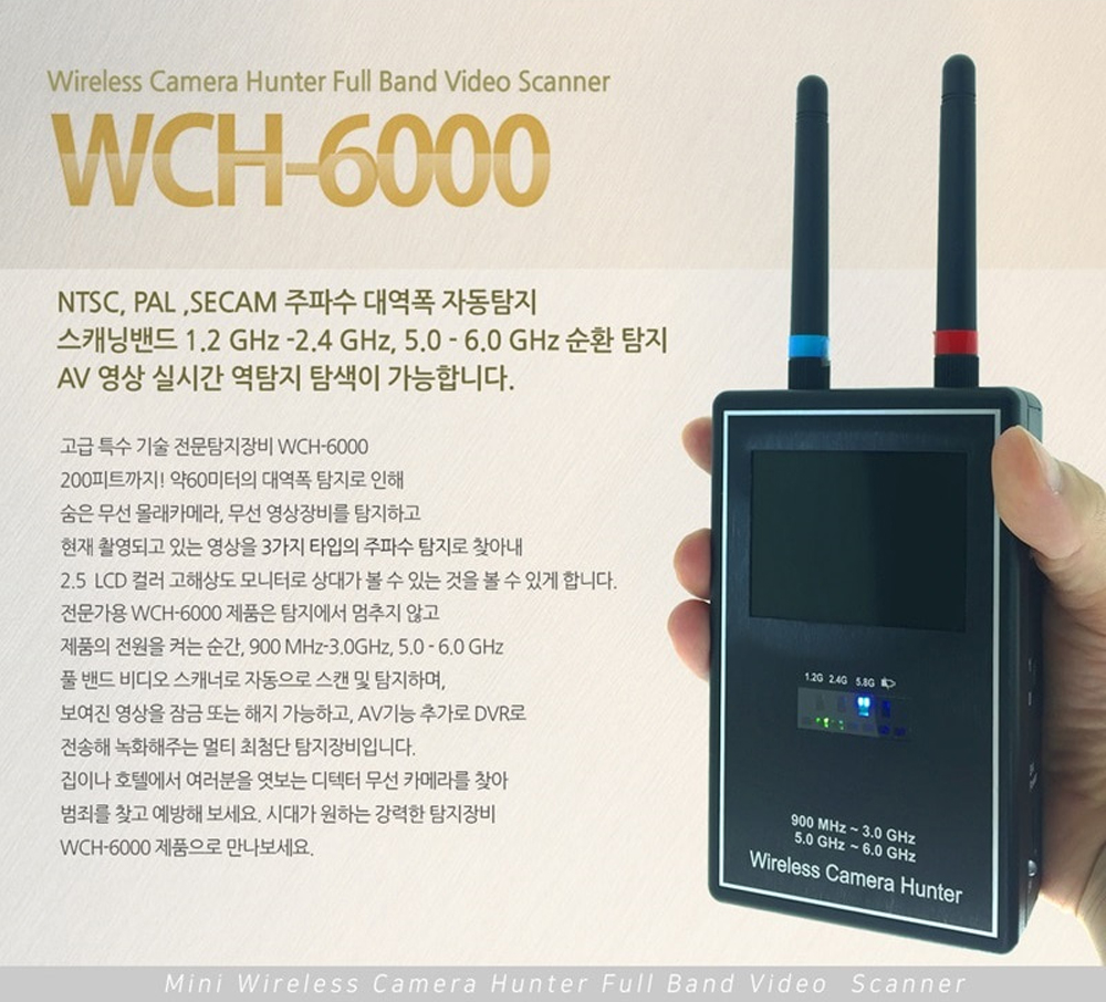 기술적으로는 NTSC, PLE, SECAM 주파수 대역을 자동으로 탐지하는 3 모드 주파수 안테나가 장착되어 있어 다양한 환경에서도 유용합니다. AV 기능을 추가하여 DVR로 전송할 수 있는 멀티 첨단 탐지장비로서, 단순한 탐지기를 넘어 보다 전문적인 보안 시스템으로 활용할 수 있습니다.