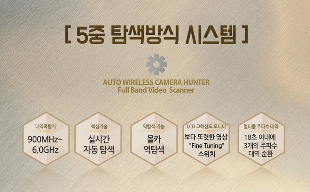 탐지기의 또 다른 특징은 2.5인치 고해상도 모니터를 통해 사용자가 즉시 결과를 확인할 수 있다는 점입니다. 또한, 5중 탐색방식 시스템과 오토스캔 기능을 통해 18초 이내에 3개의 주파수를 순환 탐지하며, 이를 통해 몰래카메라의 존재 여부를 신속하게 파악할 수 있습니다.