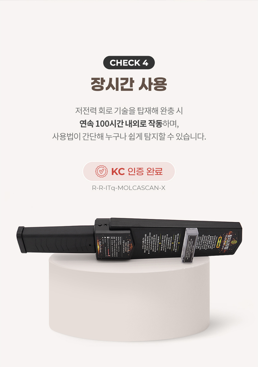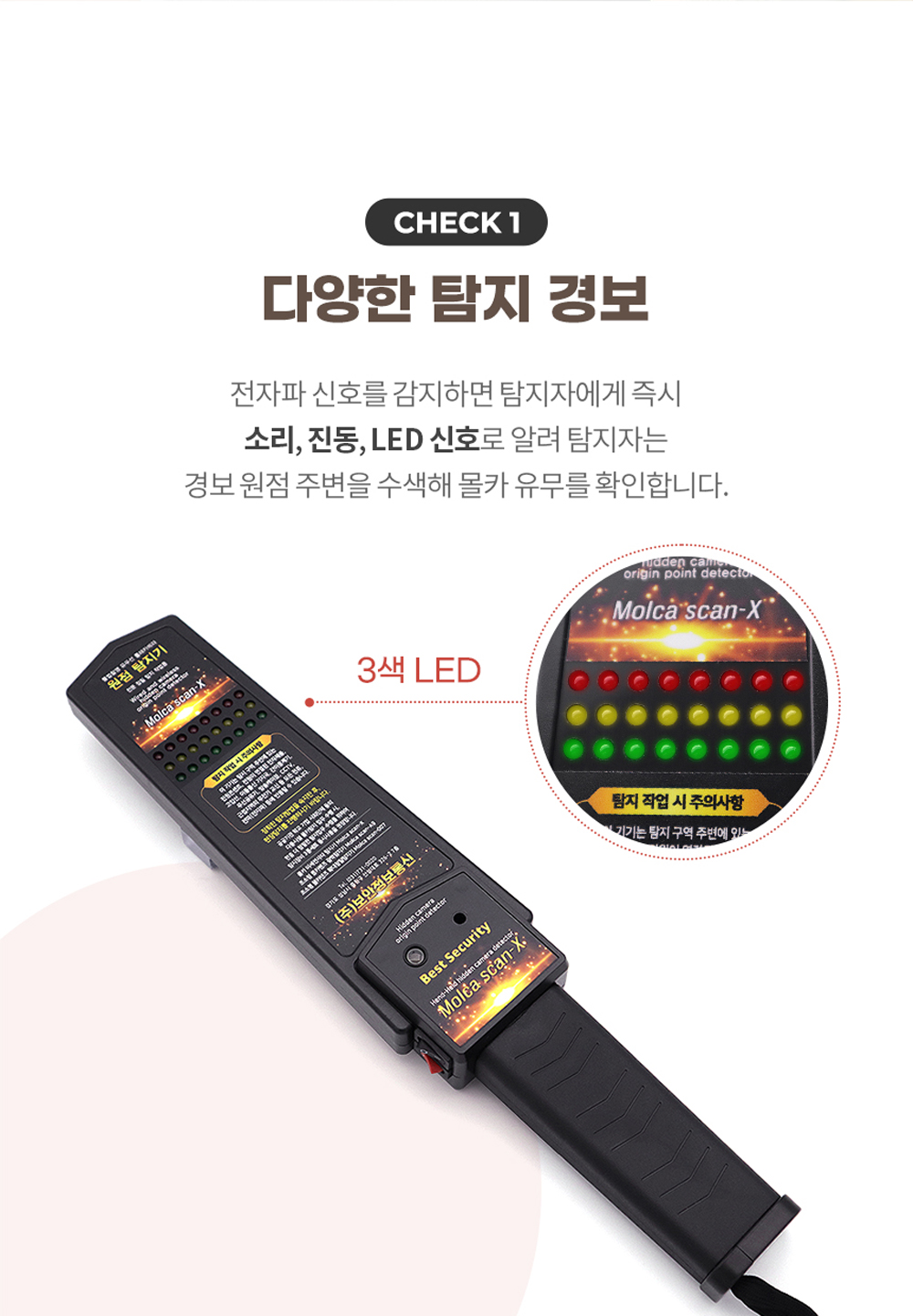 이 장비의 가장 큰 특징 중 하나는 핸드형 타입으로 제작되어 사용이 간편하다는 점이에요. 소리와 진동, LED 신호를 통해 실시간으로 경보를 제공해주므로, 사용자는 직관적으로 상황을 파악할 수 있답니다. 몸에 숨겨진 몰래카메라를 금속탐지기처럼 머리부터 발끝까지 스캔하여 탐지할 수 있는 기능도 있어요. 연속으로 약 100시간 작동이 가능하기 때문에 장시간의 탐지가 필요할 때도 무리 없이 사용할 수 있습니다.