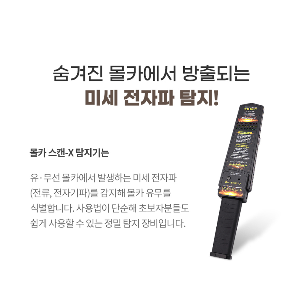 핸드형 탐지장비인 몰카스캔-X는 유/무선 몰래카메라에서 발생하는 미세 전자파를 탐지해요. 이는 전류와 전자기파를 감지하여 숨겨진 카메라를 찾아내는 데 매우 유용합니다. 또한, 주변 전파로 인한 과잉 경보를 차단해 오작동을 방지하기 때문에, 사용자는 안심하고 장비를 사용할 수 있어요. 장시간 사용이 가능하다는 점도 큰 장점인데요, 옷이나 핸드백 등 휴대용 몰래카메라도 쉽게 탐지할 수 있어요.
