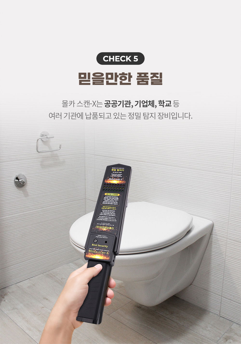 공공기관이나 기업체, 학교 등 여러 기관에서도 이 장비를 납품받아 사용하고 있을 만큼 정밀한 탐지 성능을 자랑해요. 간단한 사용방법 덕분에 전문가가 아니더라도 누구나 쉽게 사용할 수 있어요. 이처럼 다양한 장점을 가진 핸드형 탐지장비는 기존의 복잡하고 무거운 탐지기기와는 다르게, 휴대성과 실용성을 겸비한 제품입니다.