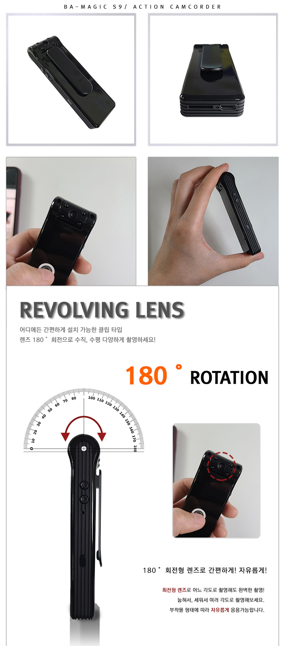 몰래카멜라의 장점 중 하나는 카메라 렌즈가 180도 회전한다는 점이에요. 이로 인해 다양한 각도에서 촬영할 수 있어 상황에 맞게 조절할 수 있답니다. 대용량 메모리도 지원하여 최대 128GB까지 확장이 가능해요. 블랙바디의 심플한 디자인은 어디에나 잘 어울리고, 눈에 띄지 않아 편리합니다.
