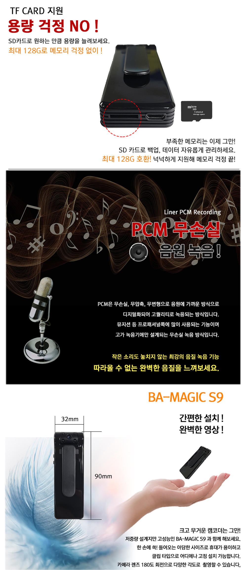 몰래카멜라는 단순하지만 효율적인 블랙바디 디자인으로 사용자의 편리함을 더욱 배가시켜요. 불필요한 불빛이나 소리, 진동이 없어 주위의 주목을 받지 않는 것도 큰 장점이에요. 128GB까지 확장 가능한 대용량 메모리로 장시간 녹화 또한 문제없어요. 게다가 음성녹음 기능은 8시간 동안 PCM 고음질로 기록하여 재생 시에도 뛰어난 청취 환경을 제공해요.