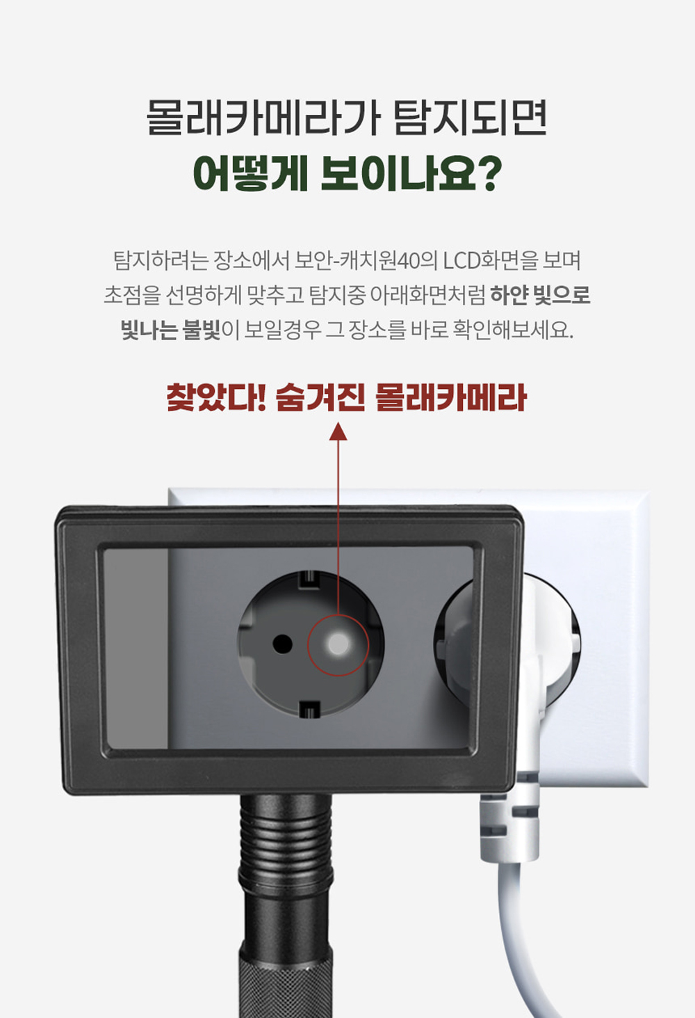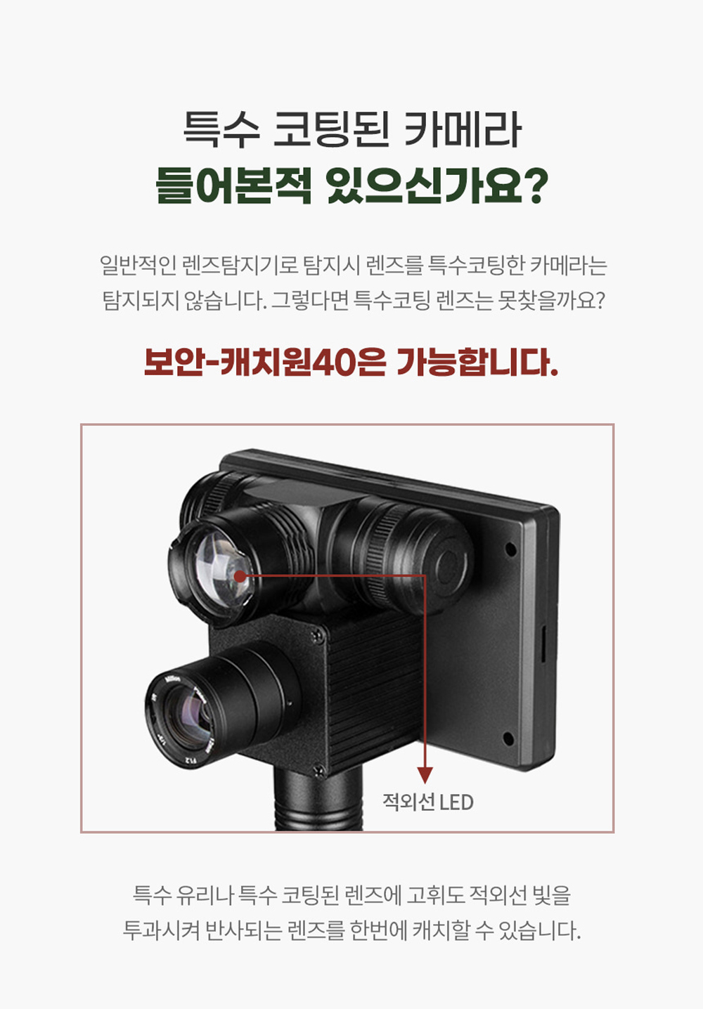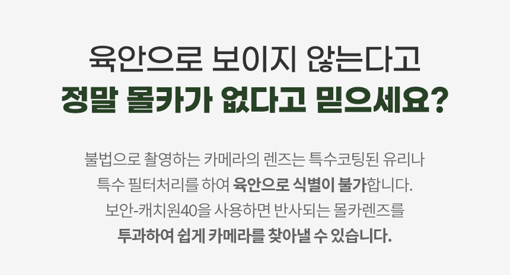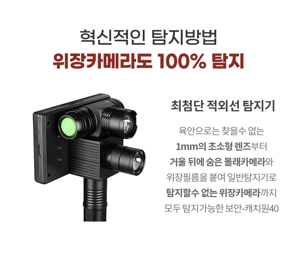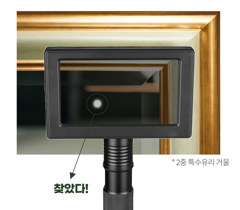 특수 코팅된 카메라 렌즈와 거울 속에 설치된 카메라 렌즈 탐지는 일반적인 방법으로는 찾기 어려운 문제를 해결해요. 거울 뒤에 설치된 카메라는 일반적으로 육안으로 식별하기 힘들지만, 이 몰카 탐지기는 그러한 문제를 손쉽게 해결할 수 있도록 설계되었어요. 또한, 필름 처리된 위장형 렌즈까지 탐지가 가능하다는 점에서 다양한 환경에서 유용하게 활용될 수 있습니다.