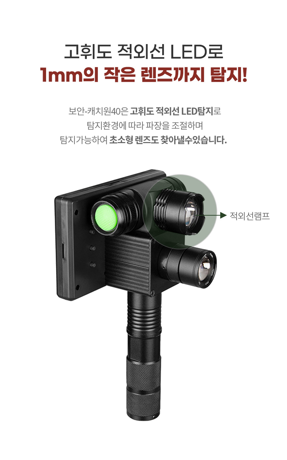 주요 기능으로는 적외선 LED가 탑재되어 있어요. 이 LED는 1mm 크기의 렌즈까지 감지할 수 있는 고휘도로 안정성을 보장해요. 또한, 특수 코팅되었거나 위장된 필름 처리 카메라도 쉽게 탐지할 수 있구요. 전문가 탐지 장비로서, 여러 관공서와 교육기관 등에 널리 납품되어 왔답니다. 더해서 고급 알루미늄 보관 가방까지 선택이 가능하니까 안전하게 보관할 수 있어요.
