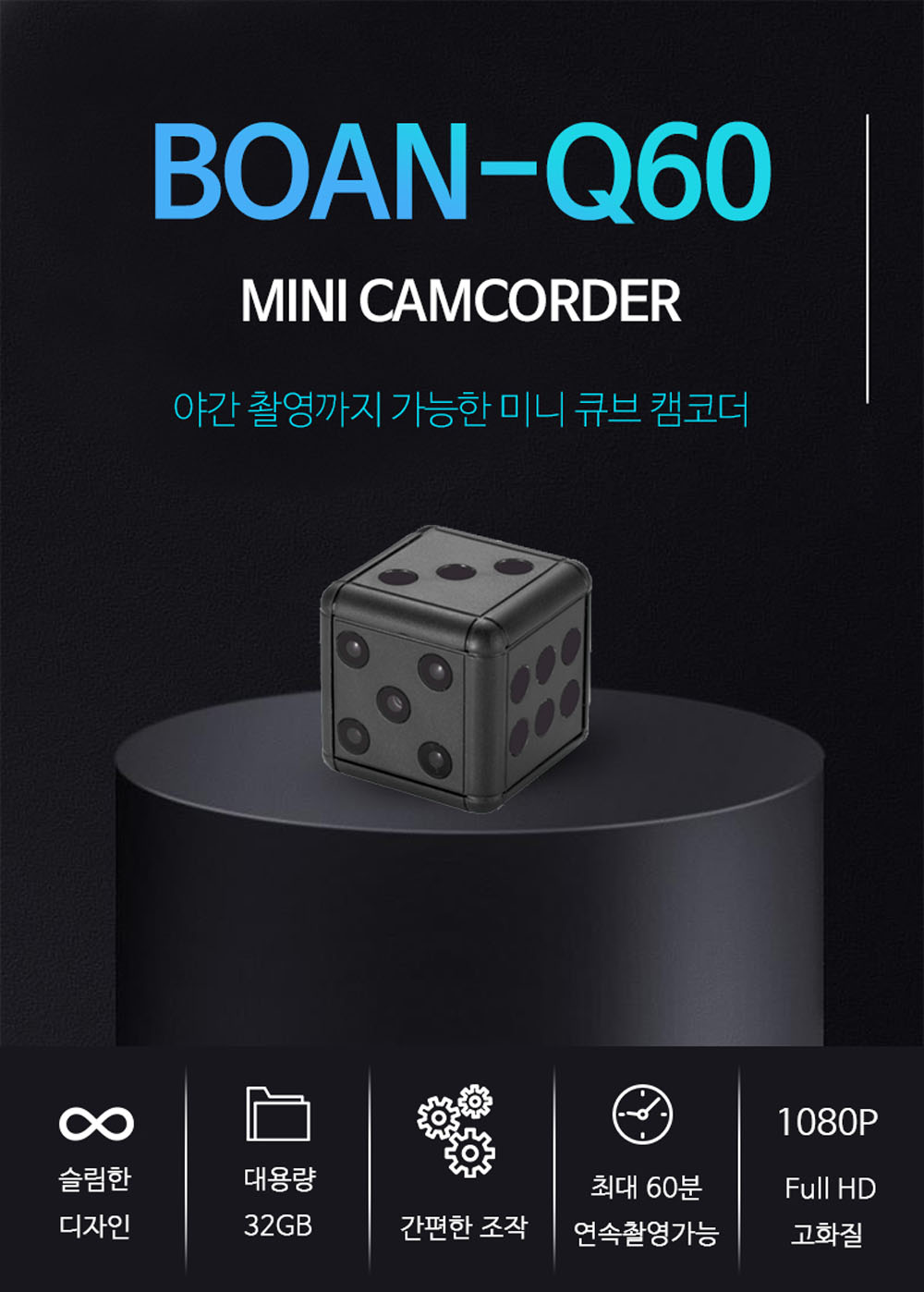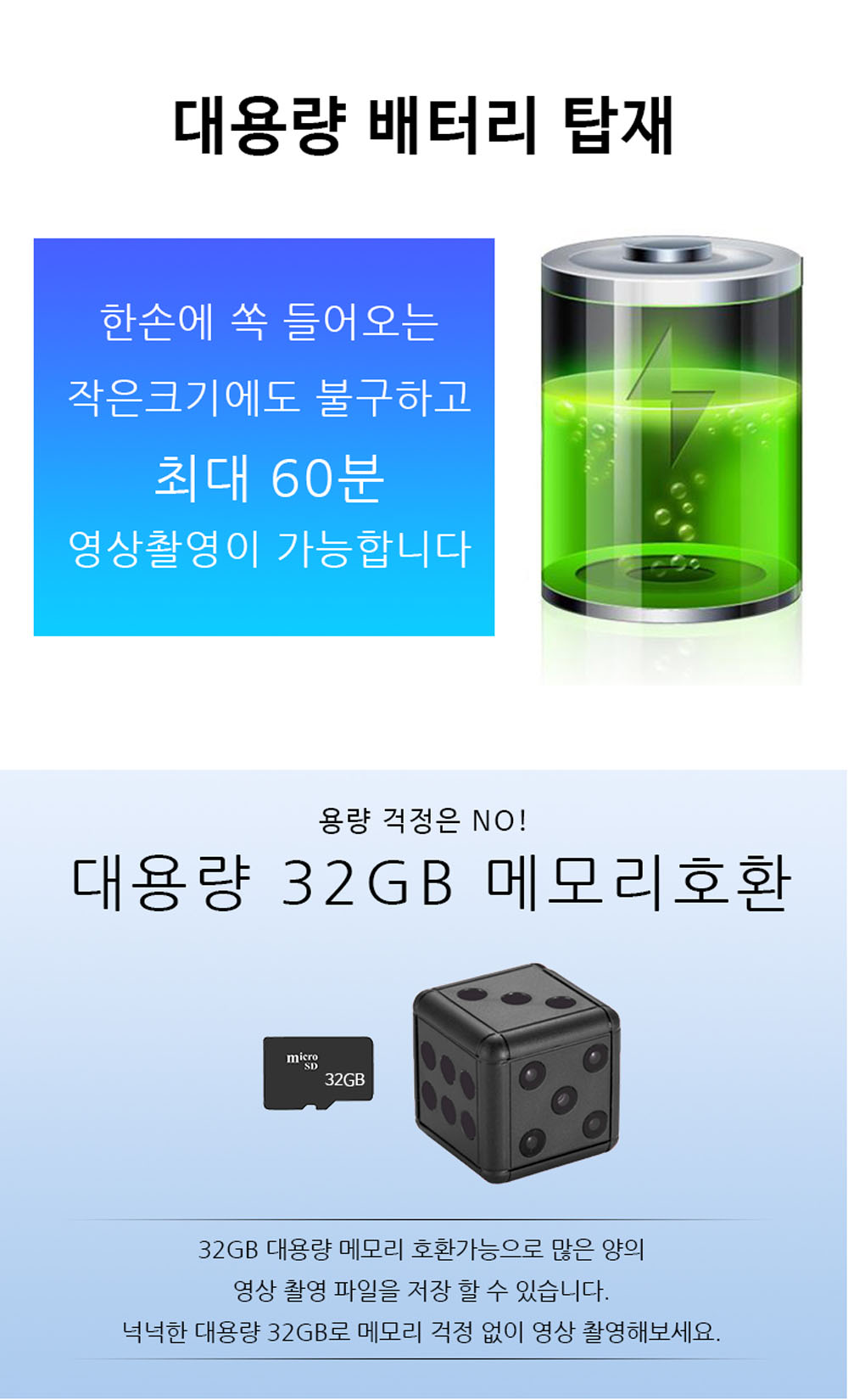 이 카메라는 주사위 형태를 가지고 있으며, 대용량 배터리가 내장되어 있어 약 60분 동안 연속 촬영이 가능합니다. 32GB 메모리 호환으로도 최대 5시간의 영상 저장이 가능해요. 3D프레임의 안정적인 영상 덕분에 촬영 시 불빛이나 진동 없이 부드럽고 명확한 화면을 제공합니다.