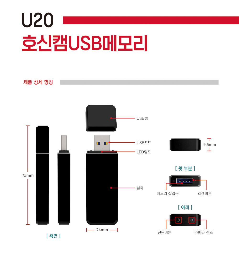 사용법도 매우 간단해서 원버튼으로 쉽게 조작할 수 있어요. 촬영 시 불빛이나 진동이 없어 은밀하게 사용하기 좋습니다. USB 포트에 메모리를 삽입하면 일반 USB 기능도 제공되니 다용도로 활용 가능해요. 영상을 촬영하려면 원버튼을 길게 눌러 전원을 켠 후 짧게 한 번 더 눌러주시면 되구요. 녹음은 원버튼을 길게 누르면 시작되니 정말 간편하죠?