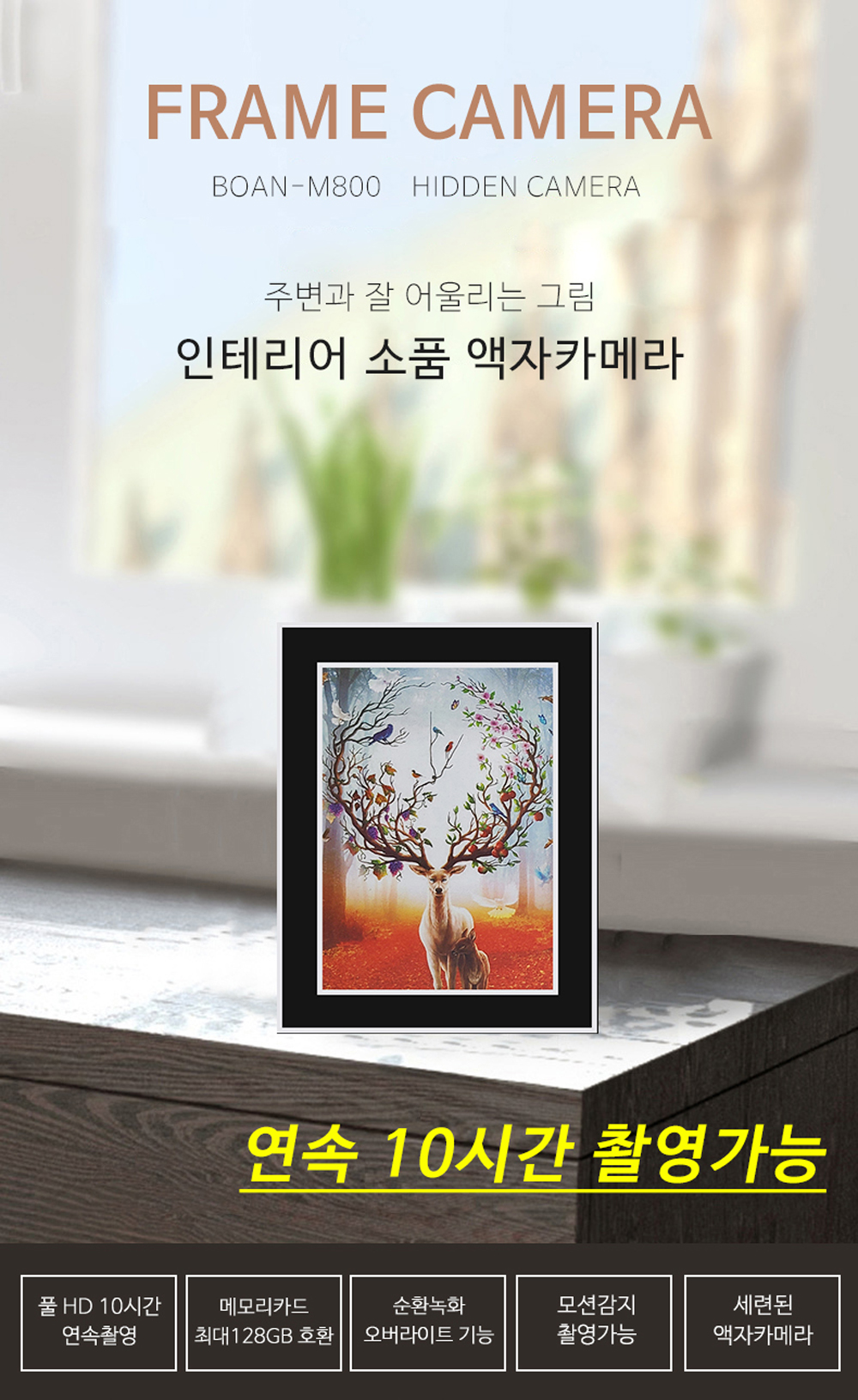 무선소형카메라는 주변 환경과 잘 어울리도록 그림 인테리어 소품으로 활용할 수 있고, 개인 사진이나 가족 사진 등으로 교체할 수 있는 장점이 있어요. 내장 배터리로 약 10시간 연속 촬영이 가능하고, 128GB까지의 메모리를 사용할 수 있어 넉넉한 저장 용량을 제공하죠. 또한 액자를 놓을 수 있는 위치라면 어디든 설치가 가능해 거실, 서재, 방 등에서 유용하게 사용할 수 있답니다.