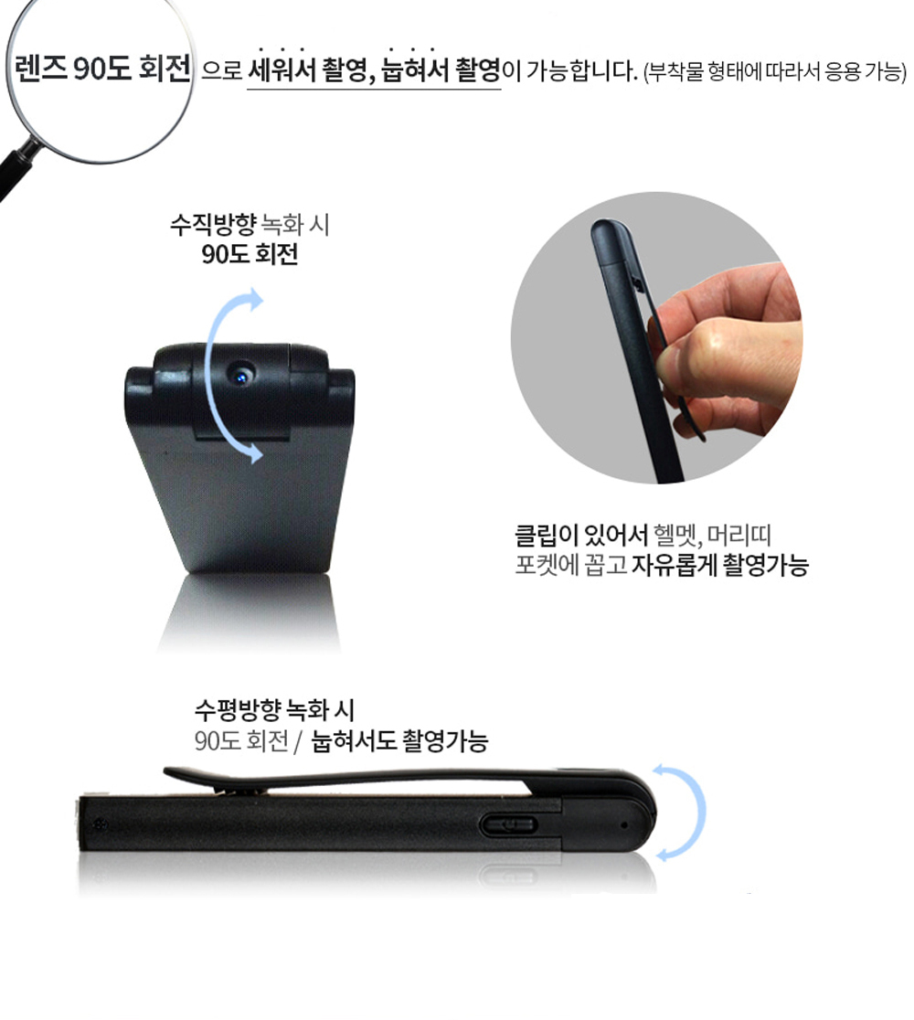 미니캠의 또 다른 매력은 90도 회전 가능한 카메라 렌즈예요. 이 기능은 다양한 각도에서 창의적으로 촬영할 수 있게 도와주죠. 약 2시간 동안 연속 촬영이 가능하고, 동작감지 대기 상태에서는 약 4시간까지 지속되어 장시간 촬영이 필요한 상황에서도 안심이에요. 64GB 대용량 메모리를 적용할 수 있어 대량의 데이터를 보관하기에도 적합하답니다. 찰탁식 클립 타입으로 설치가 간편하고, 블랙바디의 심플한 디자인은 어떤 옷차림에도 잘 어울려요. 그리고 촬영 시 불빛이나 소리 진동이 없어서 자연스러운 기록이 가능해요.