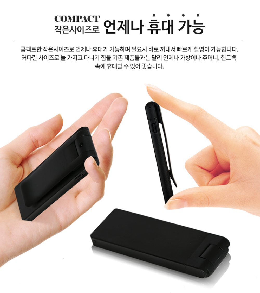 2mm 고성능 렌즈와 고감도 내장형 마이크는 더욱 선명하고 또렷한 화질과 음질을 보장해요. PCM 고음질 녹음 기능은 중요한 순간의 소리도 놓치지 않게 해준답니다. 제품 사이즈가 작고 가벼워 휴대성이 뛰어나고, DC 5V/1A 전원으로 간편하게 충전할 수 있어요. 이렇게 좋은 기능들이 가득한 만큼, 다양한 각도에서 촬영하여 창의적인 결과물을 만들어 보세요.