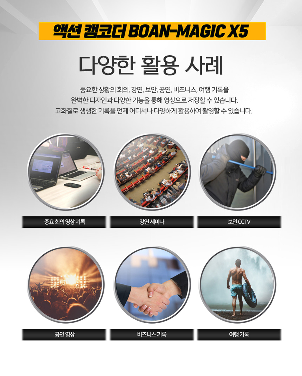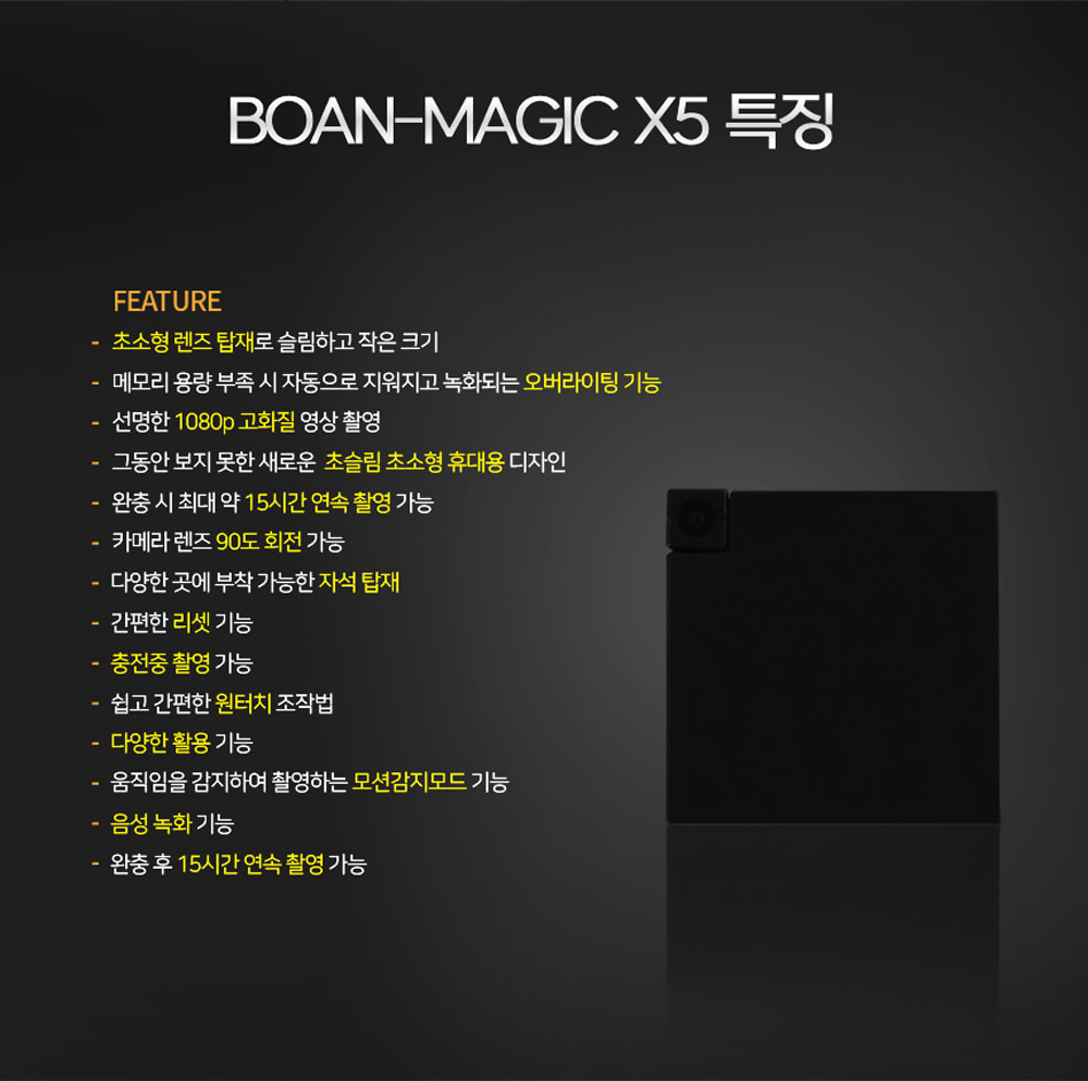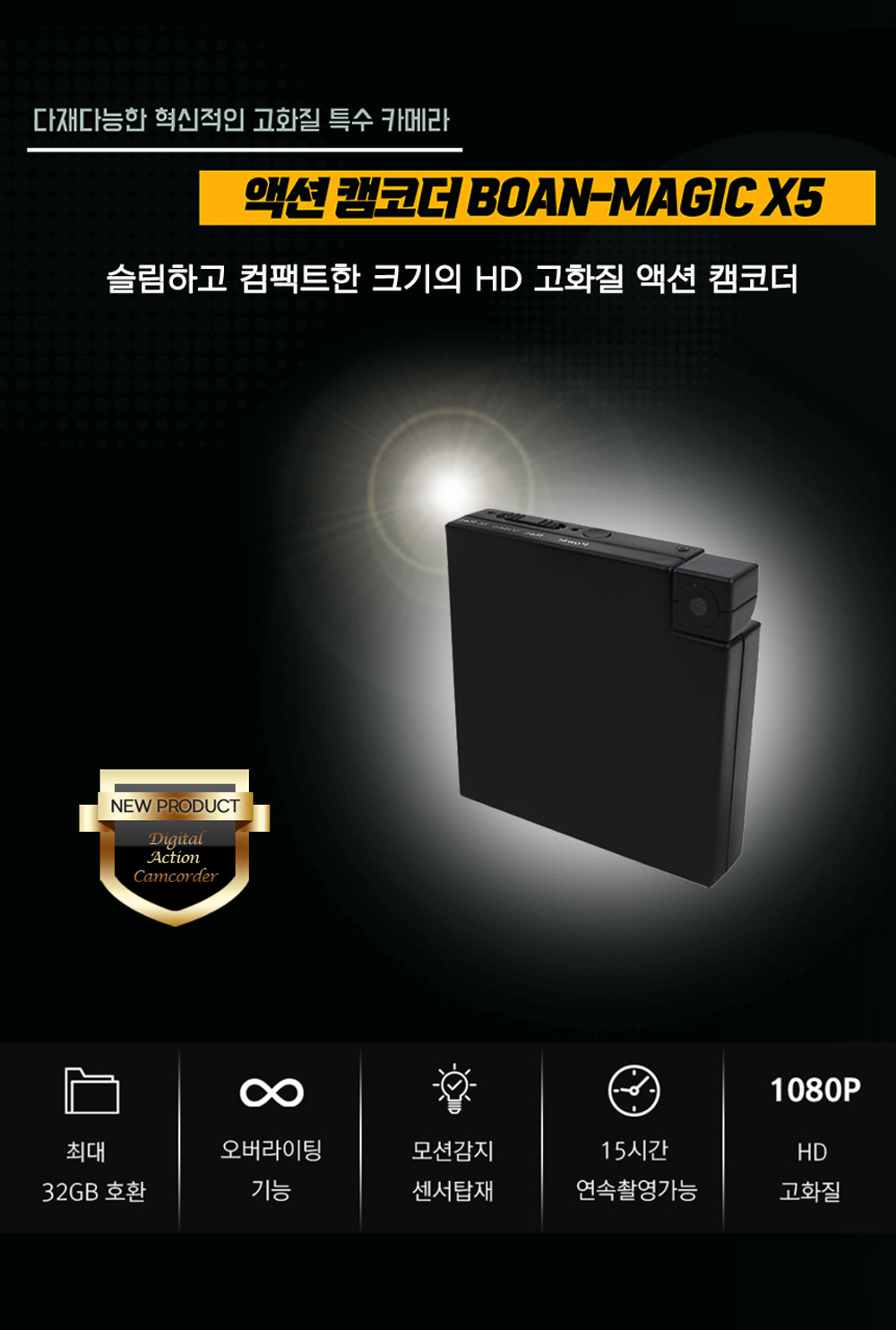이 미니캠코더의 장점은 그 휴대성에 있어요. 초슬림 초소형 사이즈 덕분에 어디든 휴대하기 쉽고, 자석이 탑재되어 있어서 필요할 때 간편하게 부착할 수 있어요. 그리고 카메라 렌즈를 90도로 회전할 수 있어 다양한 각도의 촬영이 가능합니다. 완충 시 약 15시간 연속 촬영이 가능해 장시간 이어지는 행사 촬영에도 안성맞춤이에요. 원터치로 간편하게 사용할 수 있어 많은 설정 없이 바로 시작할 수 있어요.