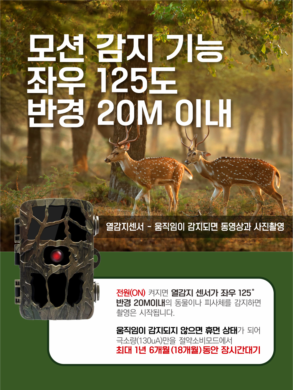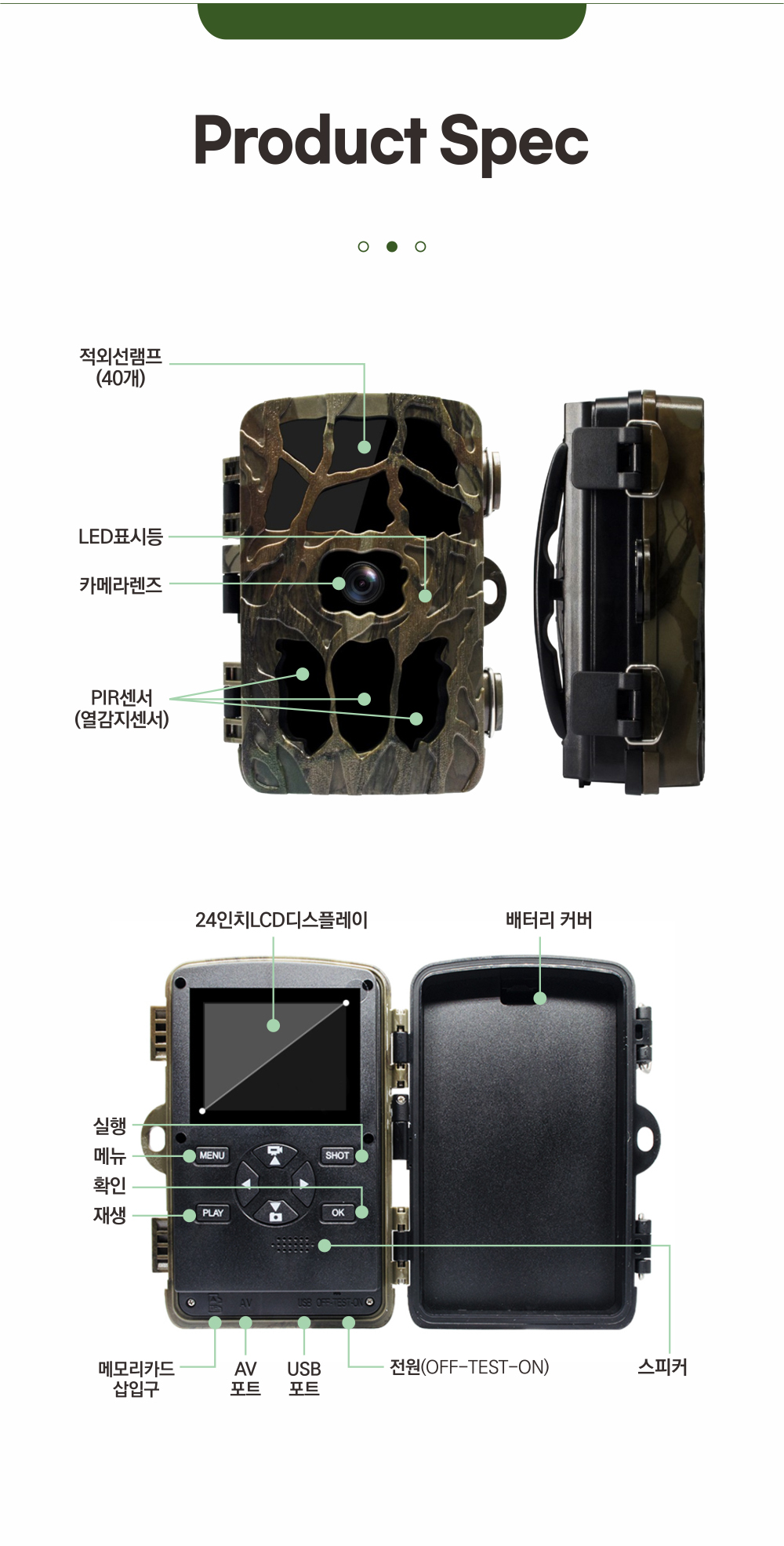 전원 연결 방법도 다양하게 제공되어 편리해요. 전원 어댑터를 이용해 상시전원을 연결할 수 있어서 장시간 사용에도 문제없어요. 또한 AA 건전지나 충전지를 총 8개까지 사용할 수 있고, 태양광 패널 연결도 가능해서 친환경적인 사용이 가능합니다. 설치 후 하단의 스위치를 TEST로 옮기고 메뉴 설정 후 ON으로 옮기면, 15초 후 자동으로 영상 촬영이 시작되니 손쉽게 작동할 수 있어요.